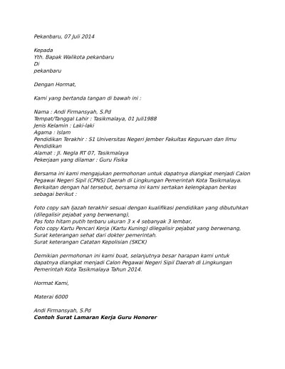 30 contoh surat lamaran kerja terbaru berbagai pekerjaan anakui com. Kementerian pendayagunaan aparatur negara dan reformasi birokrasi (menpanrb) pastikan informasi akan adanya rekrtumen cpns dan pppk tahun 2019. cpns mei 28, 2021 11:31. Juga sudah lengkap dengan contoh surat lamaran cpns umum. Asli surat lamaran kepada direktur politeknik siber dan sandi negara ditulis tangan dengan tinta warna hitam bermaterai rp.