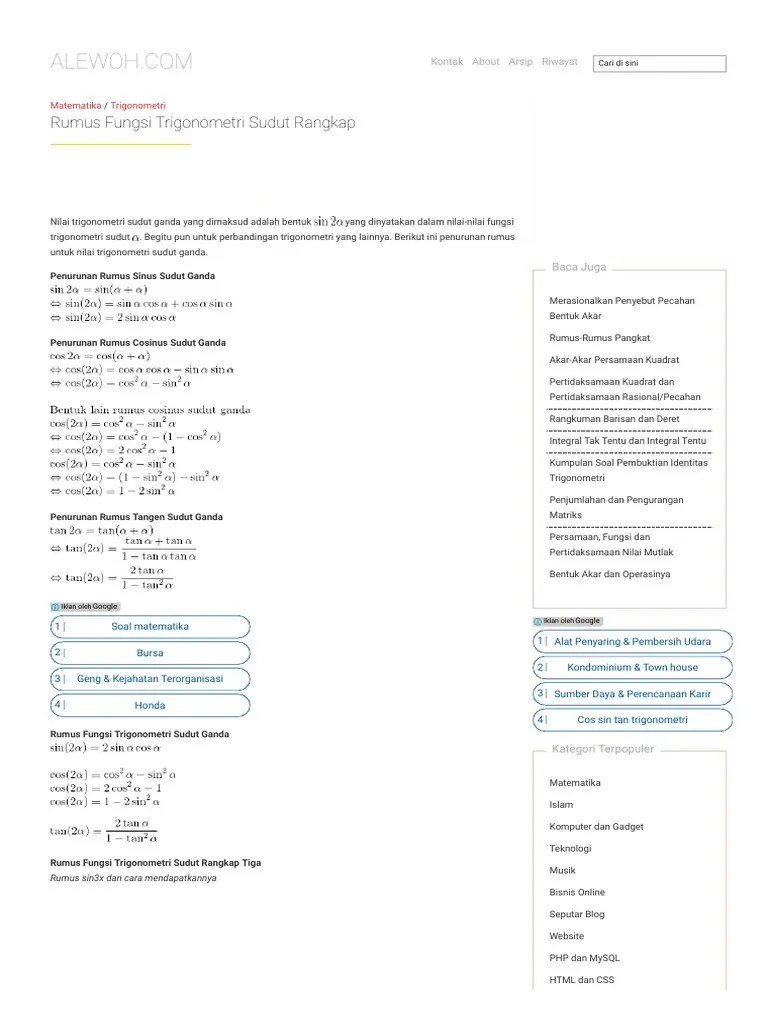 · 4 · 5 · 6 · 7 · 8 · 9 · 10 · 11. Rumus trigonometri sudut rangkap 2. Dalam matematika, trigonometri dikenal sebagai nilai perbandingan yang dikaitkan dengan sebuah sudut. Rumus trigonometri sudut rangkap meliputi fungsi sudut rangkap untuk fungsi sin, cos, dan tan. Trigonometri kelas 11 ipa sma.